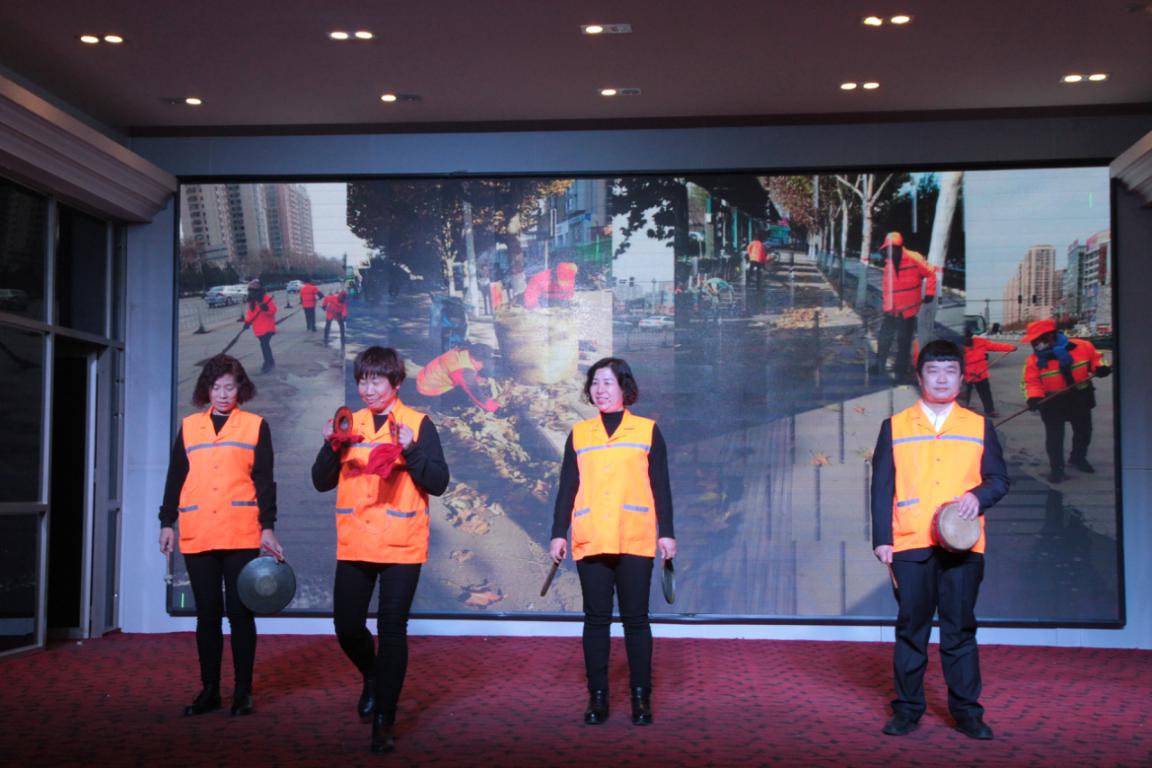 保潔部的三句半“夸夸我潔霸環(huán)衛(wèi)工”,向大家展示著有這么一群人,他們身穿橘色制服,穿梭于大街小巷,他們?nèi)蝿谌卧梗鹪缑,從事著城市最臟、最累的工作。他們就是我們的“城市美容師”——環(huán)衛(wèi)工人。