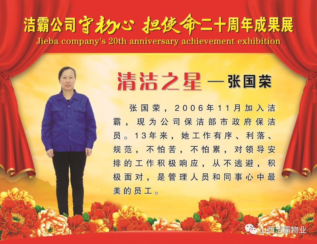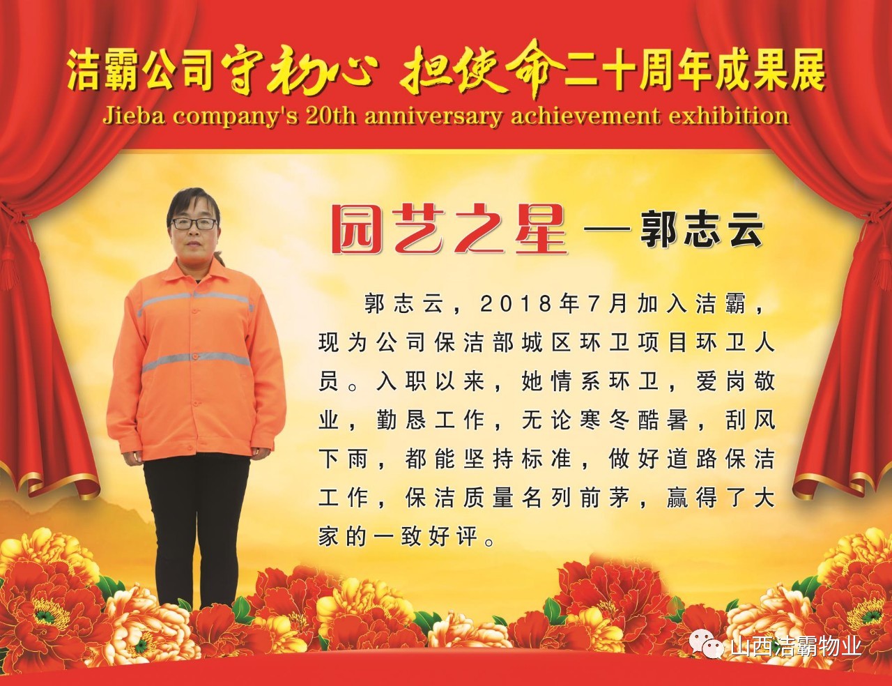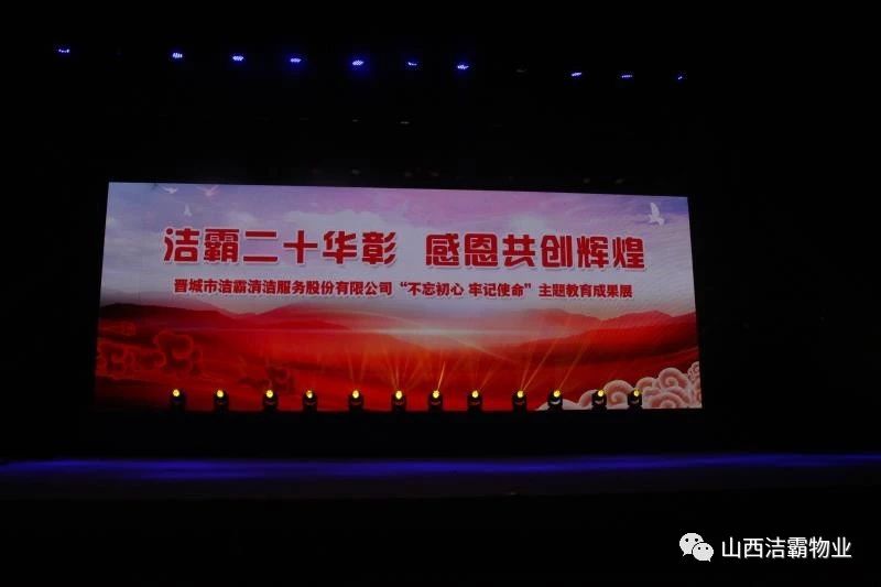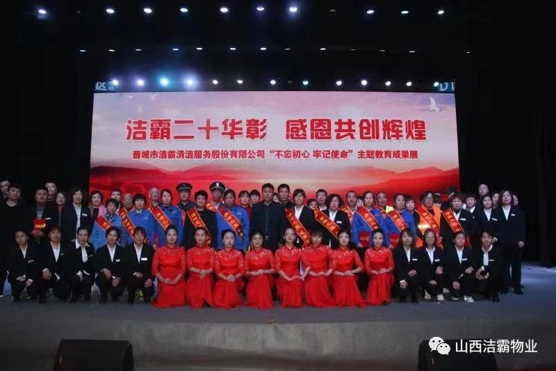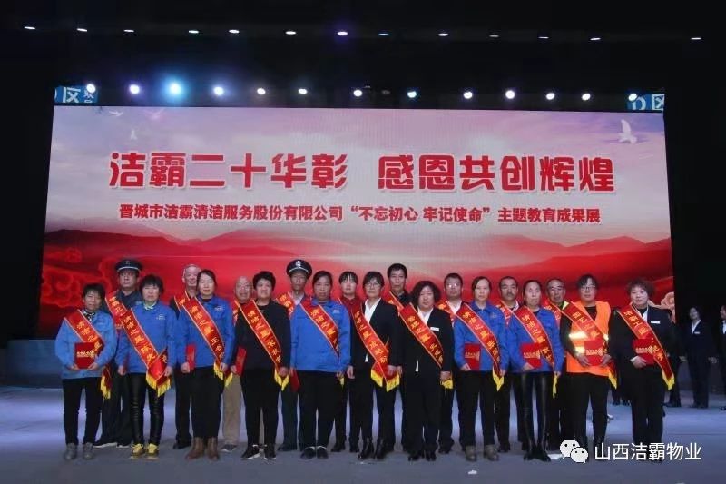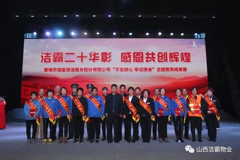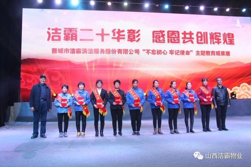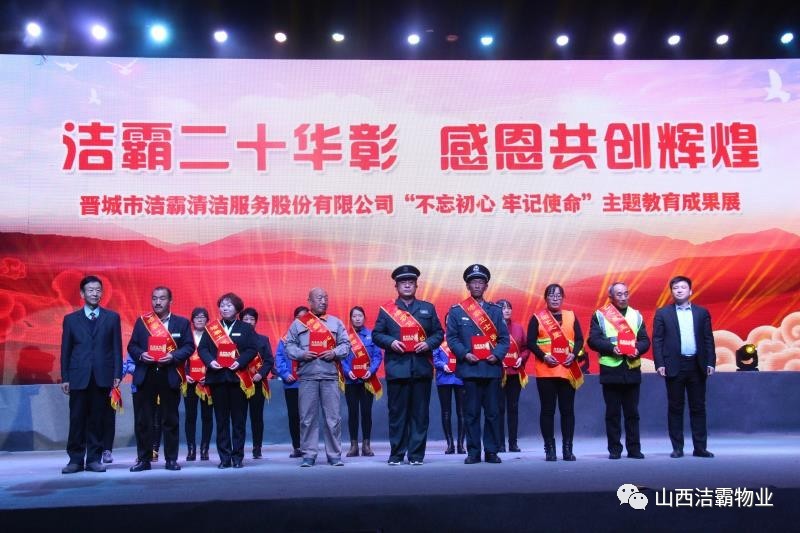 本次晚會以“潔霸二十華彰,感恩共創(chuàng)輝煌”為主題,此次慶典的核心思想是“感恩”,主要角色是潔霸的創(chuàng)業(yè)者。為此,公司對入職潔霸的創(chuàng)業(yè)功勛和一線員工進行了表彰獎勵。本次晚會共設8個獎項,包括“潔霸先鋒”“奉獻之星”“管理之星”“潔霸管家”“潔霸工匠”“清潔之星”“潔霸衛(wèi)士”“園藝之星”等。他們是:李山虎、張永智、史志霞、陳福林、王紅軍、余艷青、劉二丑、成艷粉、楊改梅、王書玲、張國榮、耿竹青、張粉霞、宋秋苗、陳先梅、張晉平、張偉山、趙瑞軍、王廣平、郭志云。晉城市原副市長成育廷、晉城市商務局原局長王新善、晉城市非公和社會組織工委書記郎軍芳、晉城市婦聯(lián)三級調(diào)研員李蓮菊、晉城市總工會商貿(mào)輕紡煙草服務業(yè)工會主席張玉濤、晉城市城區(qū)財政局局長翟明太等領導為他們頒獎。