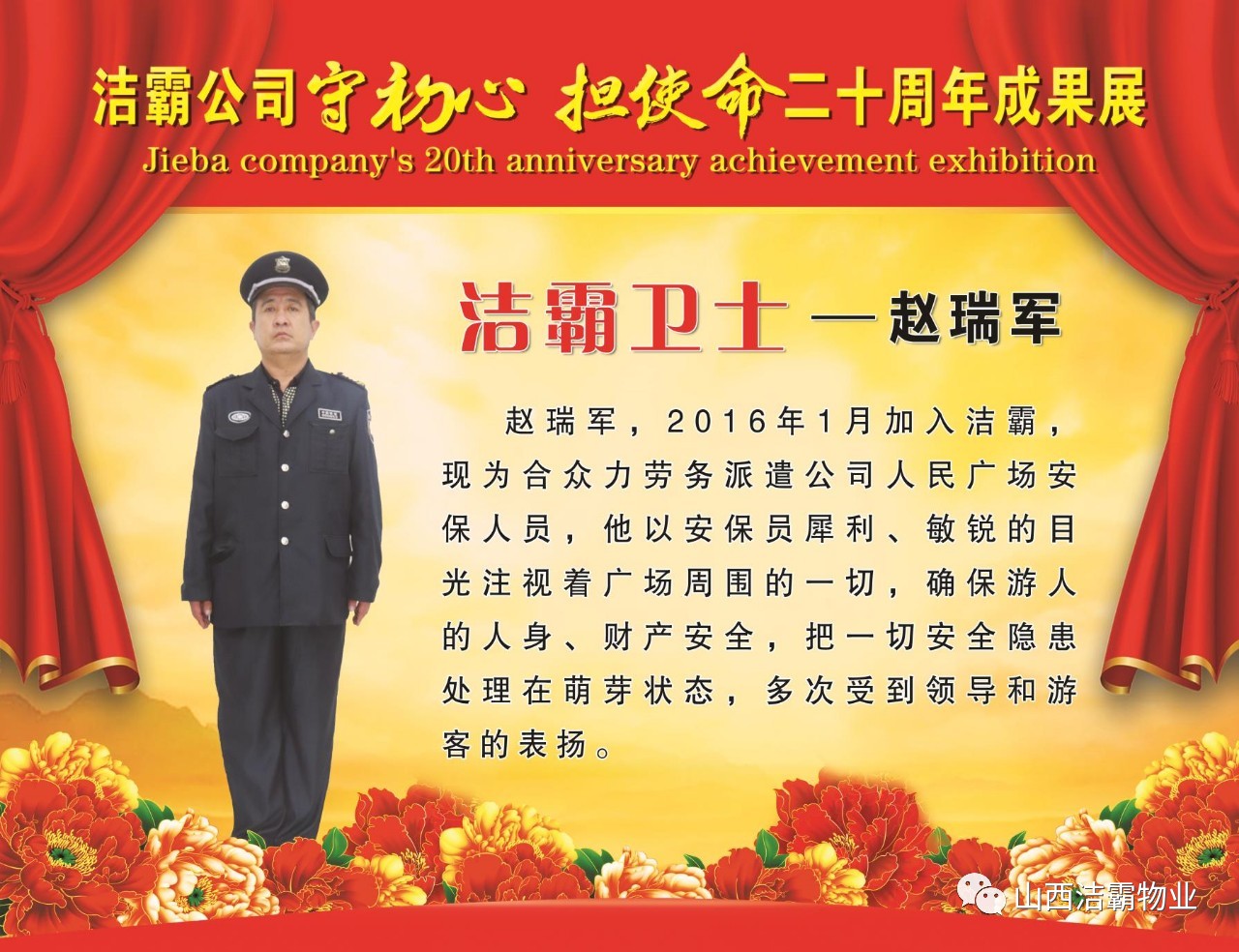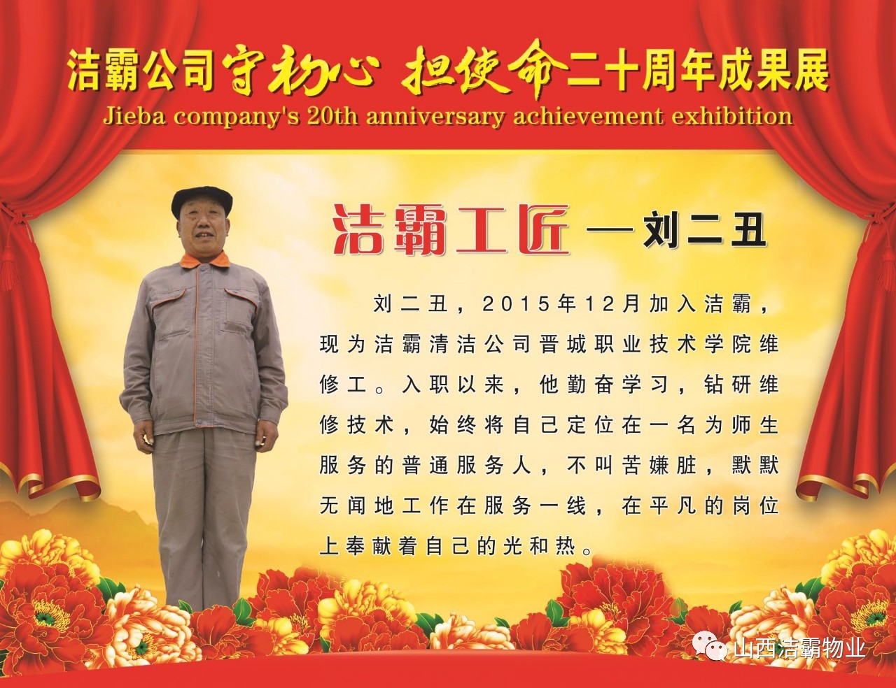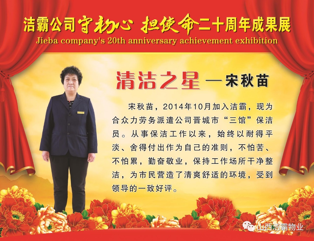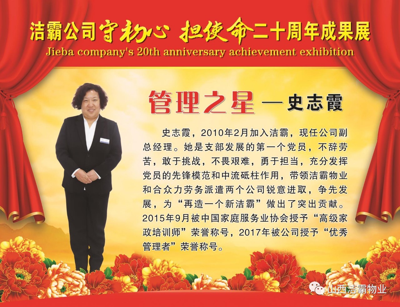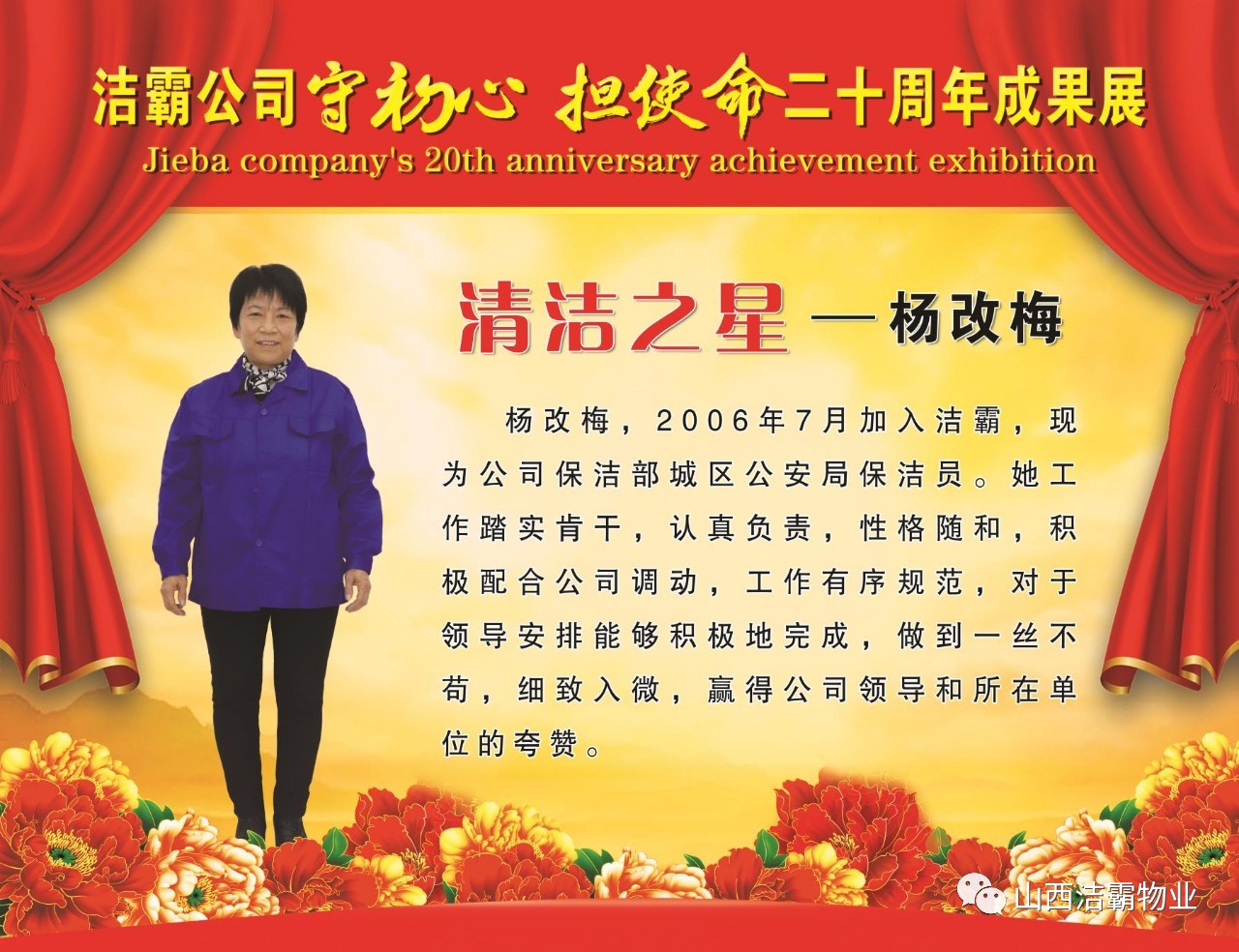 本次晚會以“潔霸二十華彰,感恩共創(chuàng)輝煌”為主題,此次慶典的核心思想是“感恩”,主要角色是潔霸的創(chuàng)業(yè)者。為此,公司對入職潔霸的創(chuàng)業(yè)功勛和一線員工進行了表彰獎勵。本次晚會共設8個獎項,包括“潔霸先鋒”“奉獻之星”“管理之星”“潔霸管家”“潔霸工匠”“清潔之星”“潔霸衛(wèi)士”“園藝之星”等。他們是:李山虎、張永智、史志霞、陳福林、王紅軍、余艷青、劉二丑、成艷粉、楊改梅、王書玲、張國榮、耿竹青、張粉霞、宋秋苗、陳先梅、張晉平、張偉山、趙瑞軍、王廣平、郭志云。晉城市原副市長成育廷、晉城市商務局原局長王新善、晉城市非公和社會組織工委書記郎軍芳、晉城市婦聯(lián)三級調(diào)研員李蓮菊、晉城市總工會商貿(mào)輕紡煙草服務業(yè)工會主席張玉濤、晉城市城區(qū)財政局局長翟明太等領導為他們頒獎。