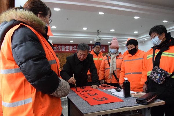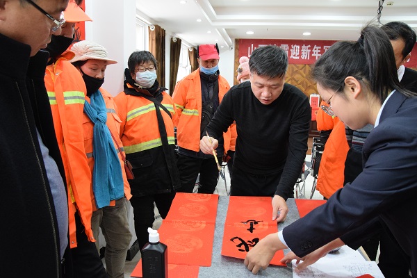 現(xiàn)場人頭攢動(dòng),熱鬧非凡,處處洋溢著歡樂喜慶的氣氛。賈大一老師剛執(zhí)墨筆,就吸引了現(xiàn)場數(shù)十名員工駐足觀賞。他的書法如行云流水,一副寓意著對(duì)新年美好祝福的春聯(lián)便一氣呵成。各位老師揮毫潑墨,一幅幅散發(fā)著清新墨香的春聯(lián)展現(xiàn)在大家面前。“梅花獎(jiǎng)”獲得者張保平老師現(xiàn)場演唱上黨梆子戲曲名段,字正腔圓,渾厚豪邁,把活動(dòng)推向了高潮。市總工會(huì)副主席韓敦峰為員工分發(fā)了對(duì)聯(lián)和防疫口罩。