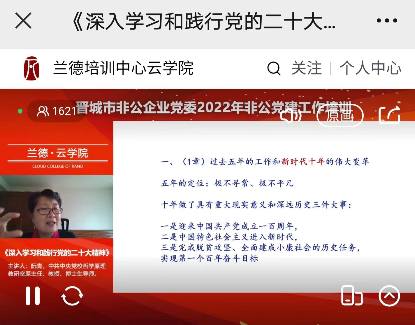 根據(jù)市非公企業(yè)黨委的安排,11月23日上午,公司黨支部組織全體黨員和入黨積極分子收看了市非公企業(yè)黨委2022年非公黨建工作培訓,聆聽了中央黨校哲學原理教研室原主任、教授、博士生導師阮青主講的《深入學習和踐行黨的二十大精神》。