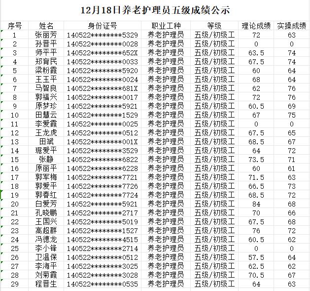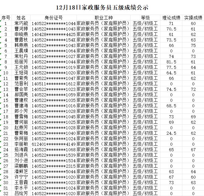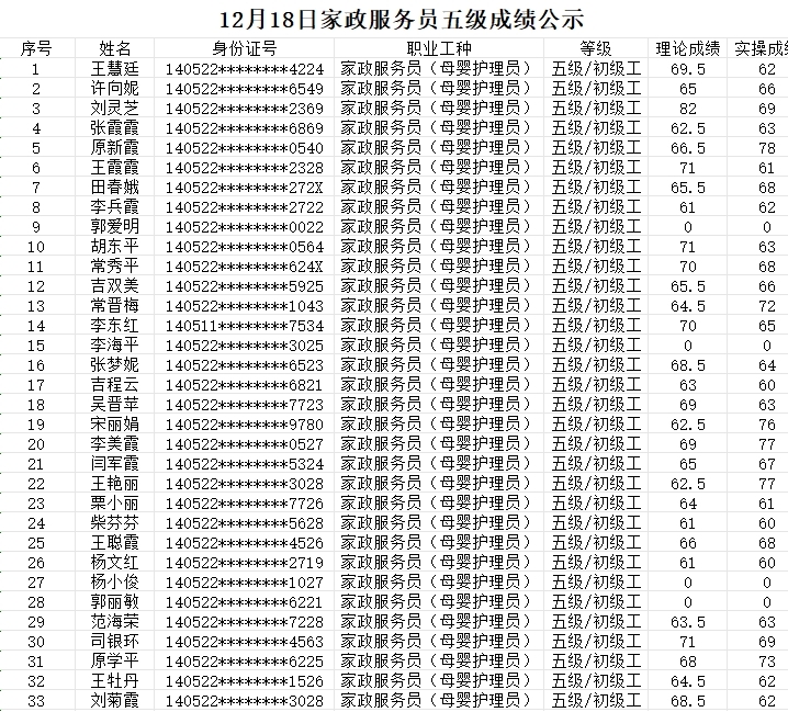 晉城市潔霸清潔服務(wù)股份有限公司職業(yè)技能等級認定中心現(xiàn)將2023年12月18日認定人員成績公示如下: