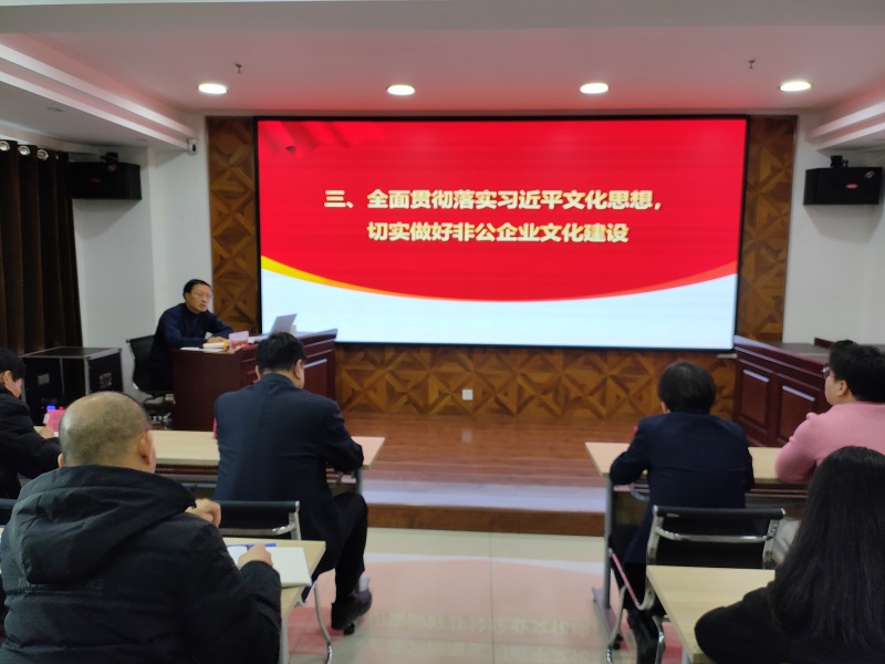 郝天順從習(xí)近平總書記對宣傳思想文化工作作出的重要指示談起,從“如何認(rèn)識(shí)和理解習(xí)近平文化思想 ”“如何學(xué)習(xí)和貫徹習(xí)近平文化思想”“全面貫徹落實(shí)習(xí)近平文化思想,切實(shí)做好非公企業(yè)文化建設(shè)”三個(gè)方面進(jìn)行了深刻闡述,指出習(xí)近平文化思想既有文化理論觀點(diǎn)上的創(chuàng)新和突破,又有文化工作布局上的部署要求,明體達(dá)用、體用貫通,明確了新時(shí)代文化建設(shè)的路線圖和任務(wù)書,在我國社會(huì)主義文化建設(shè)中展現(xiàn)出了強(qiáng)大偉力,為做好新時(shí)代新征程宣傳思想文化工作、擔(dān)負(fù)起新的文化使命提供了強(qiáng)大思想武器和科學(xué)行動(dòng)指南,并結(jié)合非公企業(yè)實(shí)際,要求要緊緊圍繞學(xué)習(xí)貫徹習(xí)近平文化思想,圍繞貫徹黨的二十大關(guān)于文化建設(shè)的戰(zhàn)略部署,強(qiáng)化黨建引領(lǐng)作用,帶動(dòng)企業(yè)文化發(fā)展,將文化建設(shè)作為企業(yè)戰(zhàn)略,不斷創(chuàng)新文化理念,將企業(yè)文化實(shí)體化、制度化,促進(jìn)企業(yè)文化升華,推動(dòng)各項(xiàng)工作落地見效。