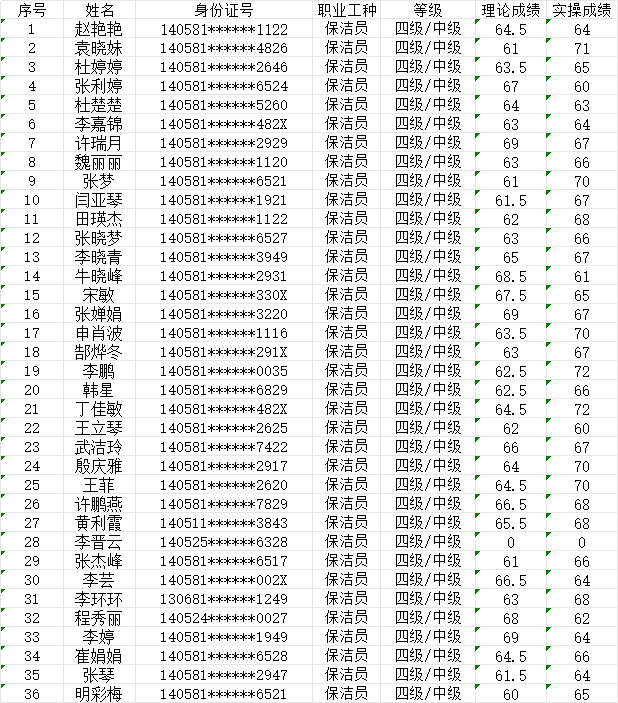 晉城市潔霸清潔服務(wù)股份有限公司職業(yè)技能等級(jí)認(rèn)定中心現(xiàn)將2024年5月23日認(rèn)定人員成績(jī)公示如下: