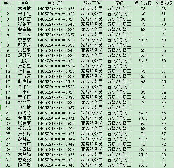 2024年8月31日第33批家政服務(wù)員初級(jí)認(rèn)定人員成績(jī)公示
