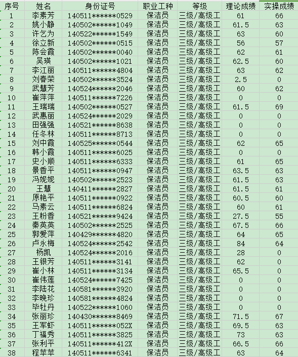 晉城市潔霸清潔服務(wù)股份有限公司職業(yè)技能等級認(rèn)定中心2024年9月1日第36批保潔員高級認(rèn)定人員成績公示