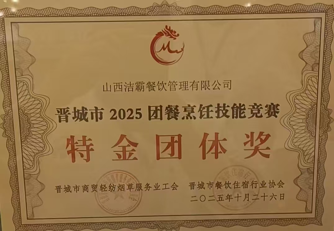 10月26日,由晉城市總工會、晉城市商務(wù)局、晉城市人力資源和社會保障局主辦,晉城市商貿(mào)輕紡煙草服務(wù)業(yè)工會委員會、晉城市餐飲住宿行業(yè)協(xié)會承辦的“情系職工 美好食光”晉城市2025團餐烹飪技能競賽在高都大酒店圓滿落幕,山西潔霸餐飲管理有限公司斬獲“特金團體獎”。